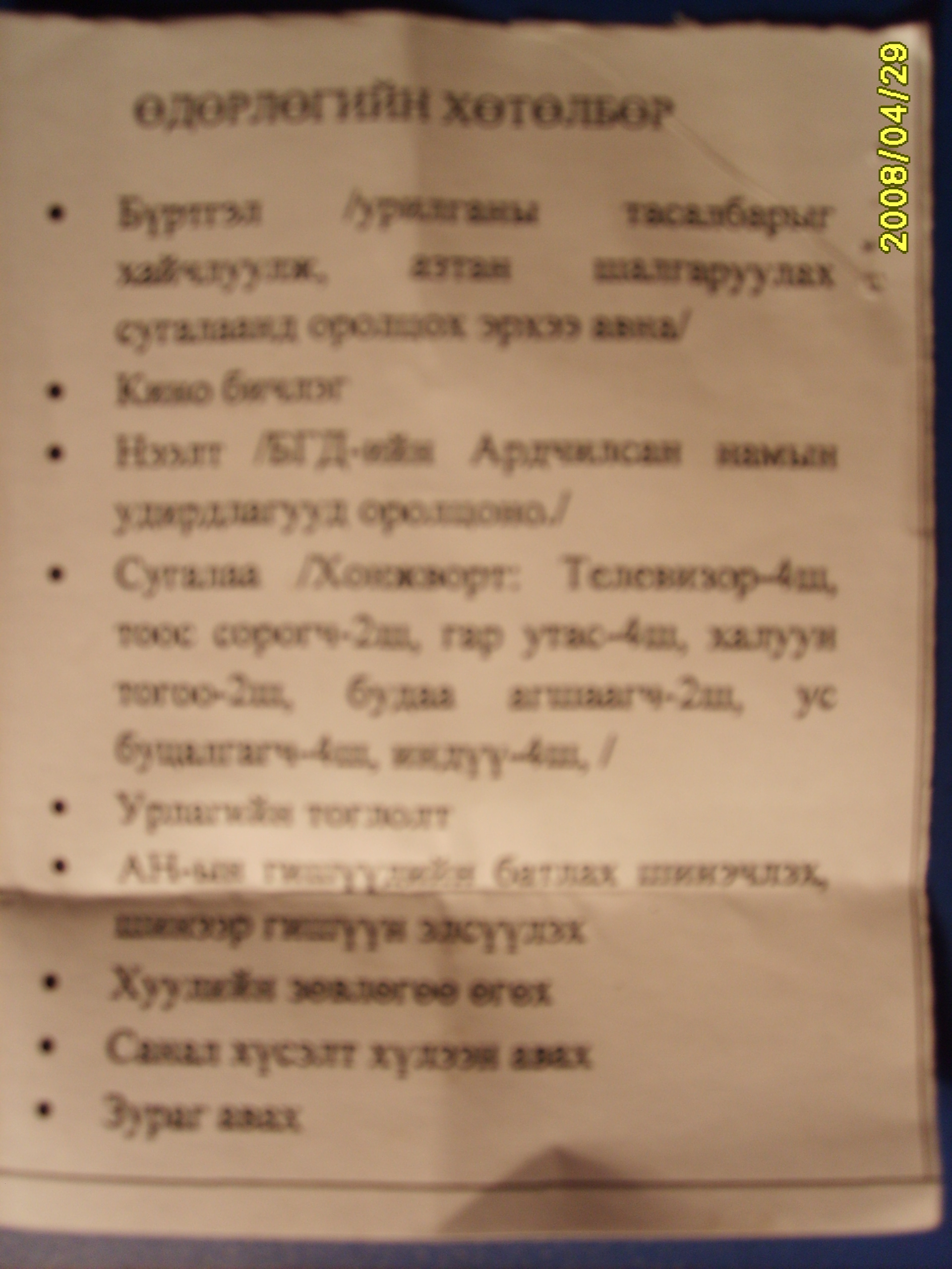Сонгууль эхлээгүй байхад ингэж байгаа юм чинь эхэлбэл замбараа задгаа бүрэн алдах нь ойлгомжтой. Бодвол манай Баянгол дүүргийн “нэр дэвшигч” мөнгөө цацаж байгаа бололтой. Ийм новшийн юмнуудаас мөнгийг нь аваад бай. Тэгээд л “хулхидчих” Бас ийм зүйлүүдийг баримтжуулж байвал сайнсан. Нэг их “том” юм биш ч гэсэн жишээ болгож үүнийг үзүүлж байна.